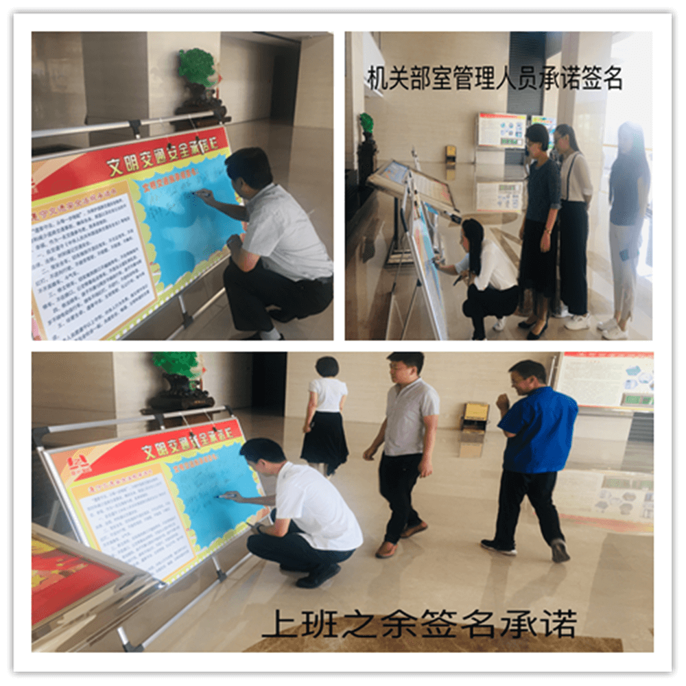 簽訂“遵守交通安全法規(guī)承諾書(shū)”。公司制作了“遵守交通安全法規(guī)承諾欄”版面十余塊,擺放在醒目位置,以部門(mén)為單位,每位員工在版面上進(jìn)行簽名承諾。公司總經(jīng)理郭釧帶頭在《文明交通承諾欄》上簽名,其他領(lǐng)導(dǎo)和部門(mén)員工也陸續(xù)進(jìn)行了簽名,通過(guò)交通安全承諾簽名,使每位員工時(shí)刻提醒自己,履行自己承諾。