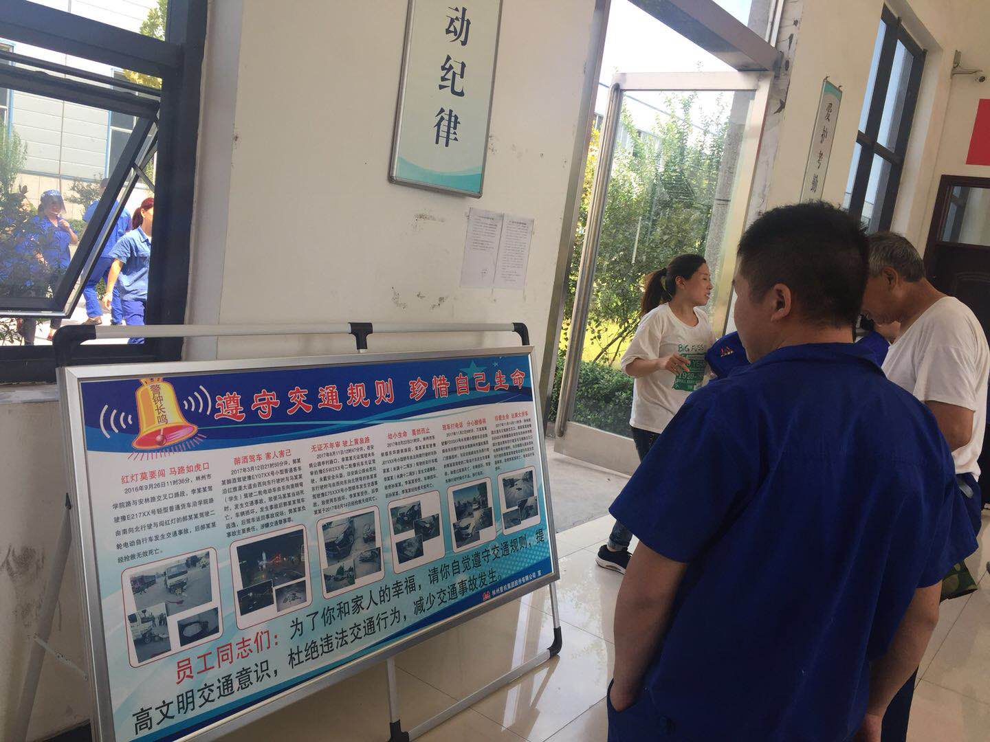其次,公司加大宣傳力度。在公司門口、考勤室等地?cái)[放交通安全宣傳版面,懸掛交通安全條幅,并不間斷地播放交通宣傳教育口號(hào),提醒廣大員工上下班時(shí)刻注意交通安全,提高交通安全意識(shí),自覺(jué)遵守交通規(guī)則。同時(shí),要求各單位利用班前會(huì)、工作例會(huì)、車間版面及微信平臺(tái)等多種形式,對(duì)本單位員工進(jìn)行交通安全教育,做到交通安全教育工作常態(tài)化、制度化。